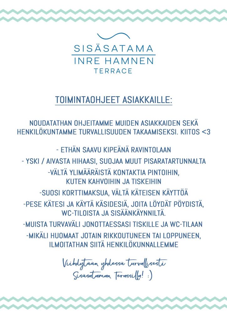 Koirat ovat tervetulleita Sisäsataman Terassille! Valvothan kuitenkin koiraasi koko vierailusi ajan ja huolehdit, ettei siitä ole muille terassin asiakkaille haittaa.
